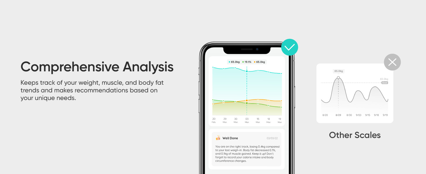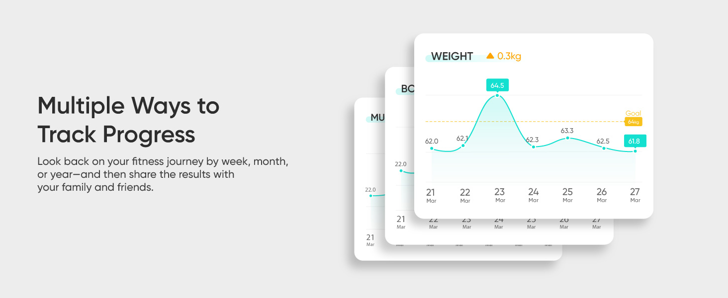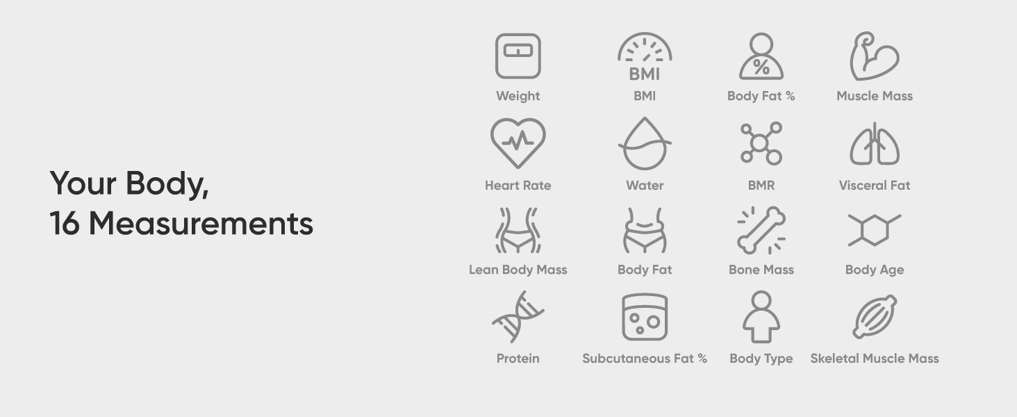 - Monitor 16 health metrics, including body fat and heart rate, with data sent directly to your phone.