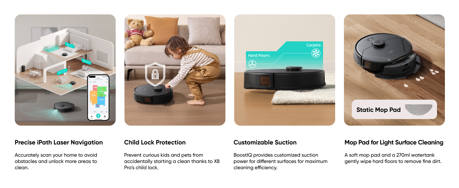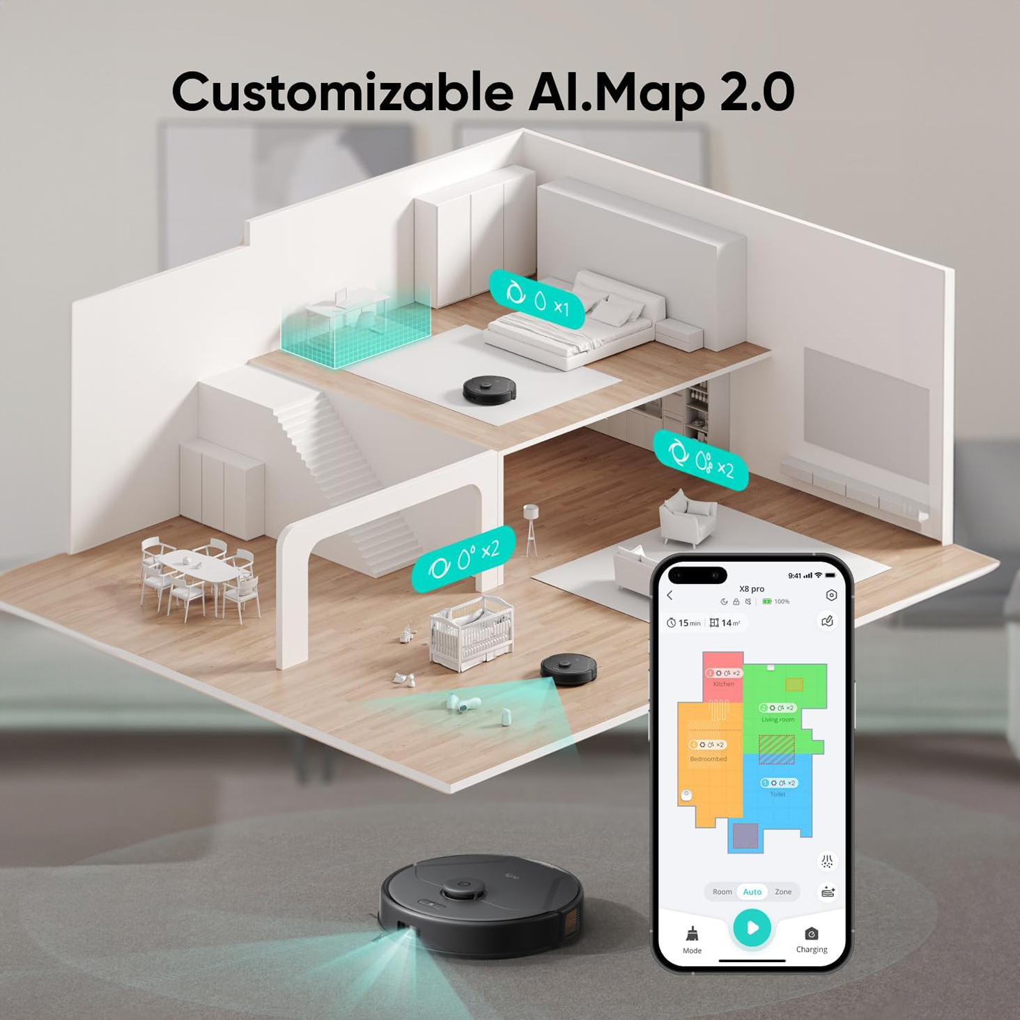- The X8 Pro creates precise maps of your home to track cleaning routes, avoid obstacles, and cover more areas effectively.