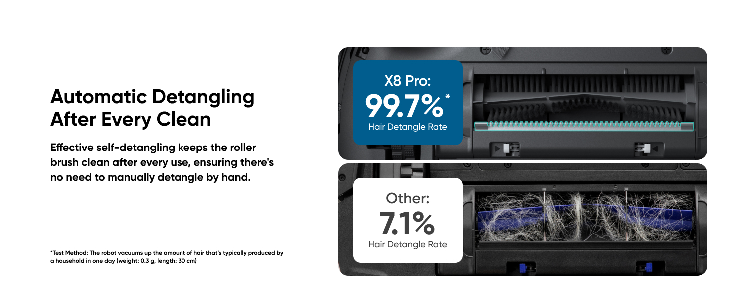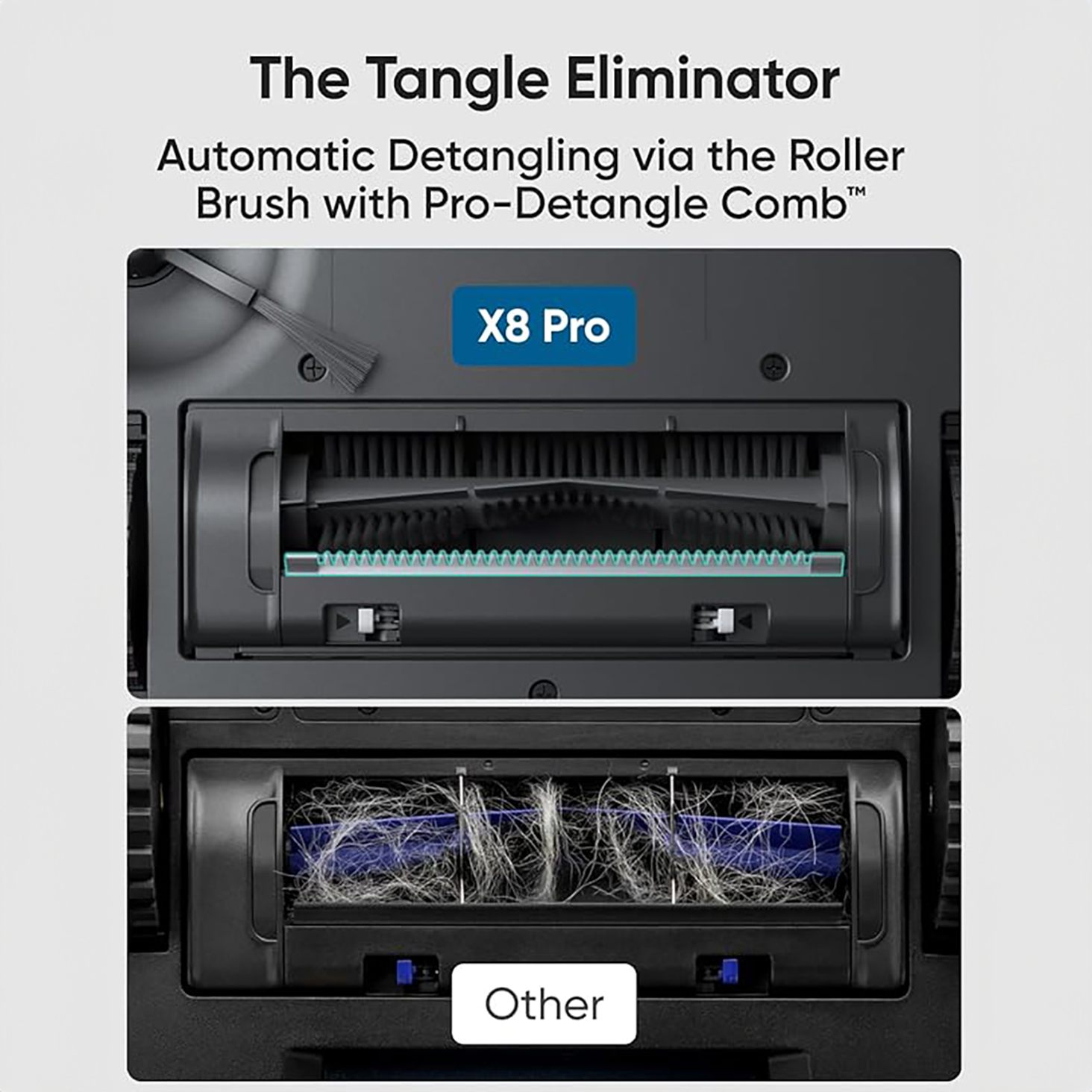 - No more manual roller brush cleaning. The X8 Pro features a Pro-Detangle Comb that automatically removes tangled hair after each clean.