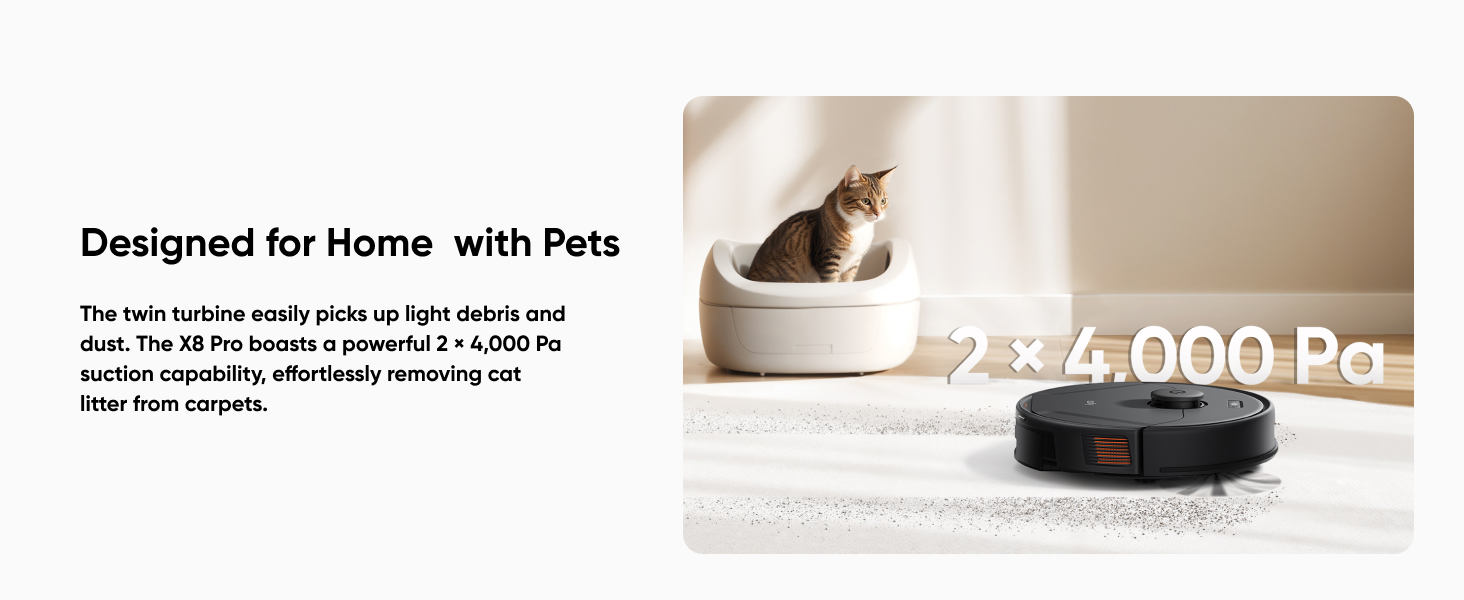 - With its powerful 2× 4,000 Pa Twin-Turbine suction, the X8 Pro effortlessly removes pet hair from deep within carpets, leaving them clean and hair-free.