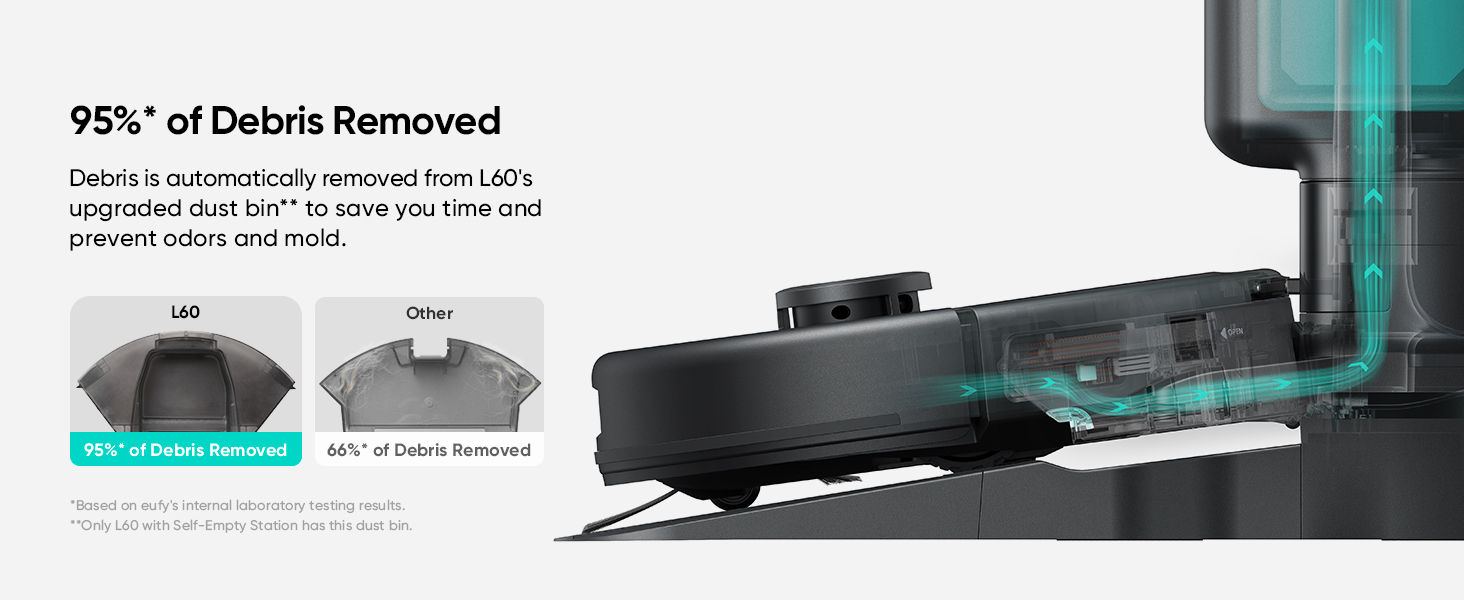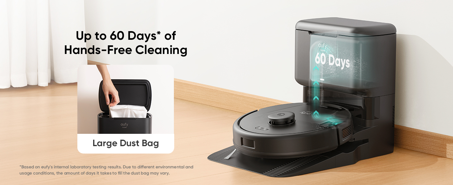 - With 17,000 Pa of suction power, dust and debris are efficiently drawn from the L60ās dust bin and transferred to a 2.5 L dust bag in the Self-Empty Station, which can last up to 60 days.