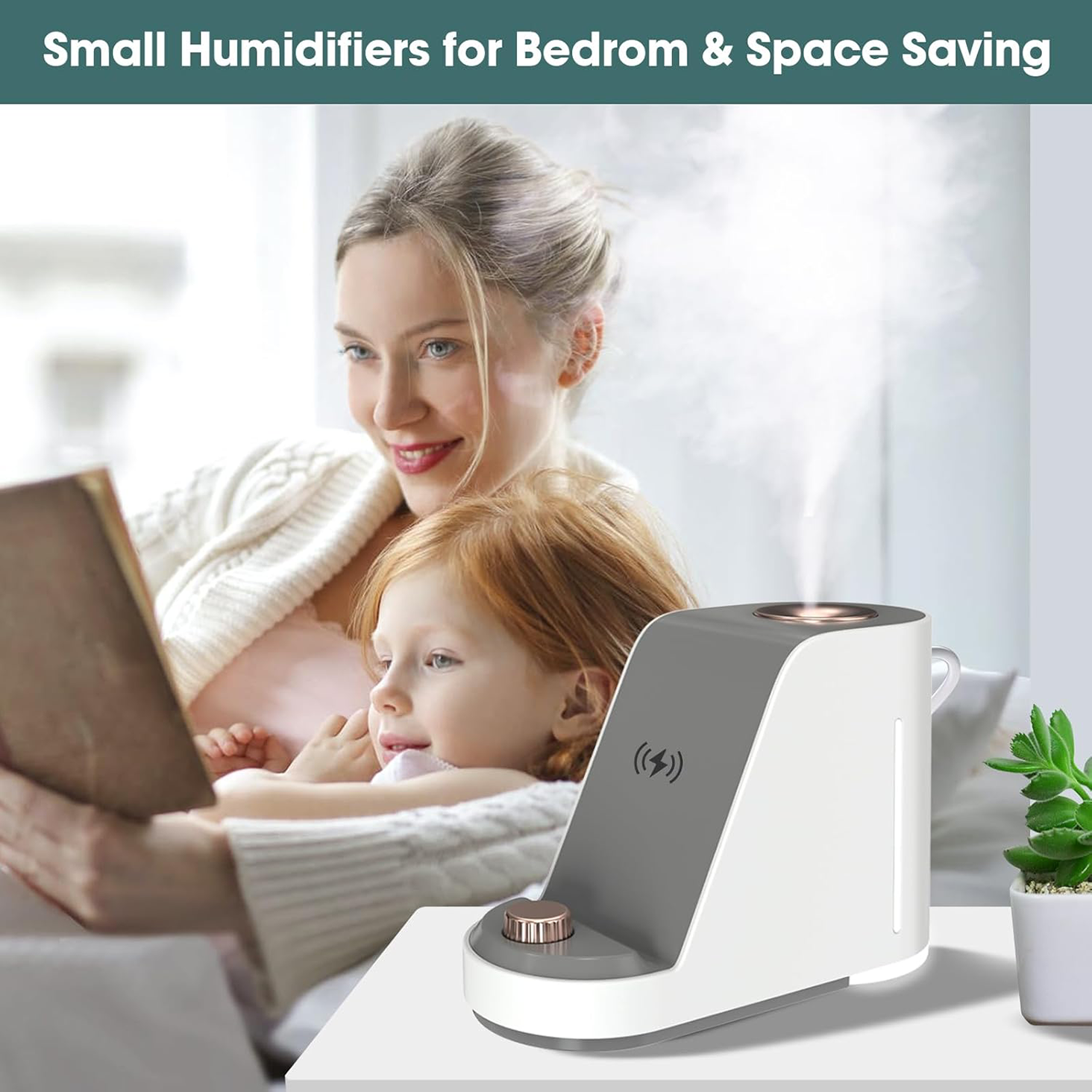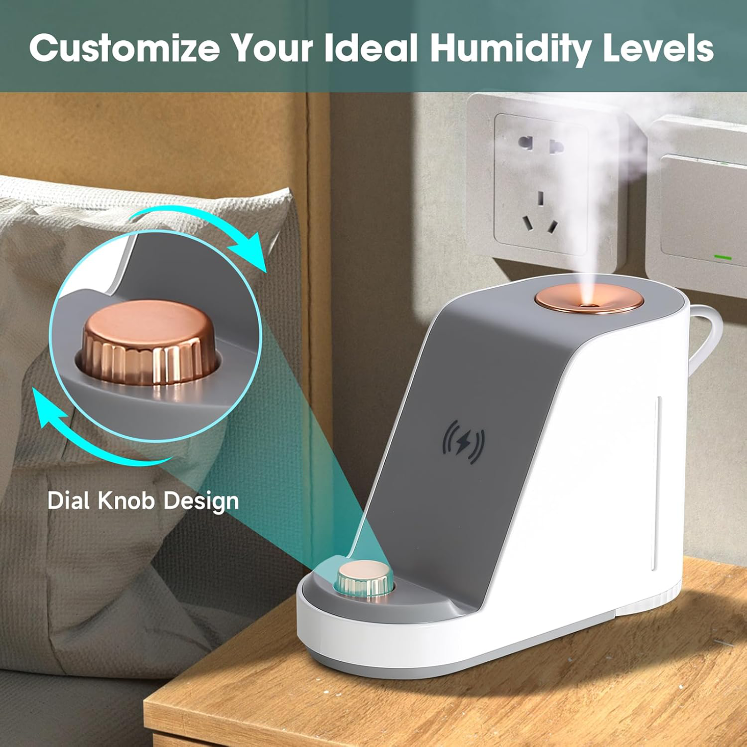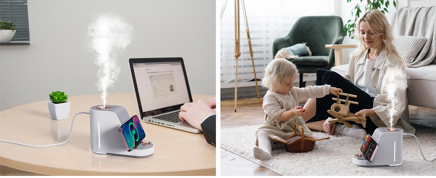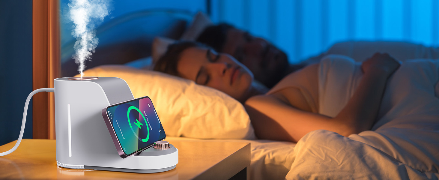 - Experience the ultimate convenience with ultrasonic humidification, wireless charging, a night light, and a phone holder.