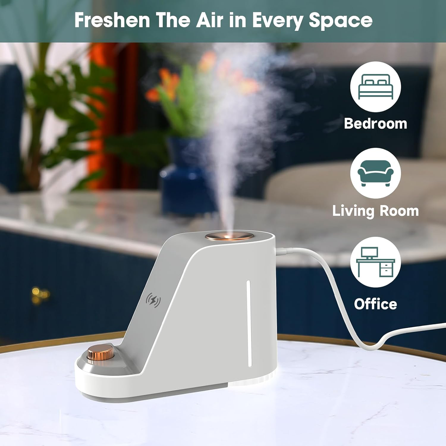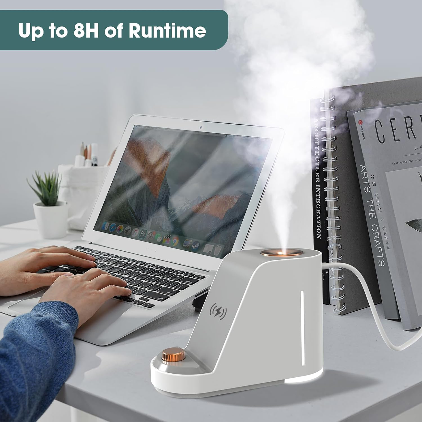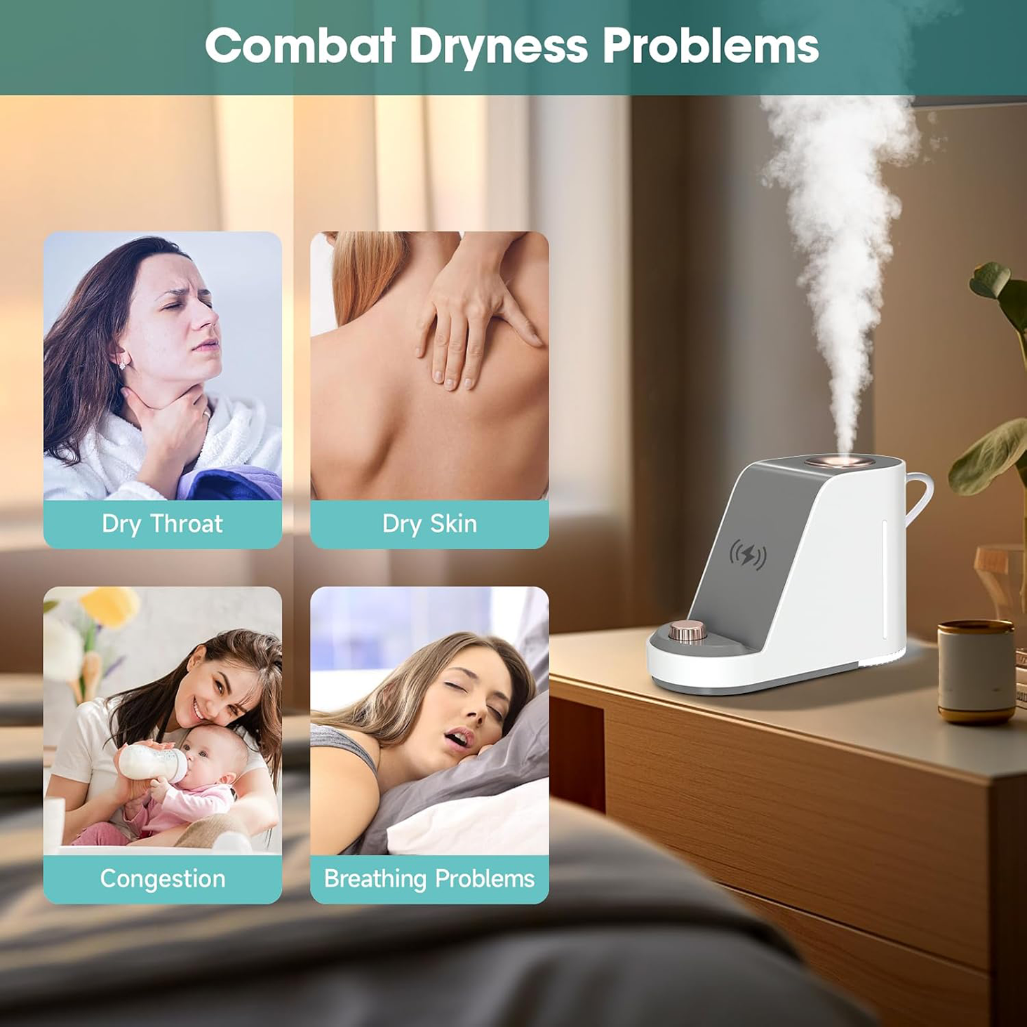 - Experience the ultimate convenience with ultrasonic humidification, wireless charging, a night light, and a phone holder.