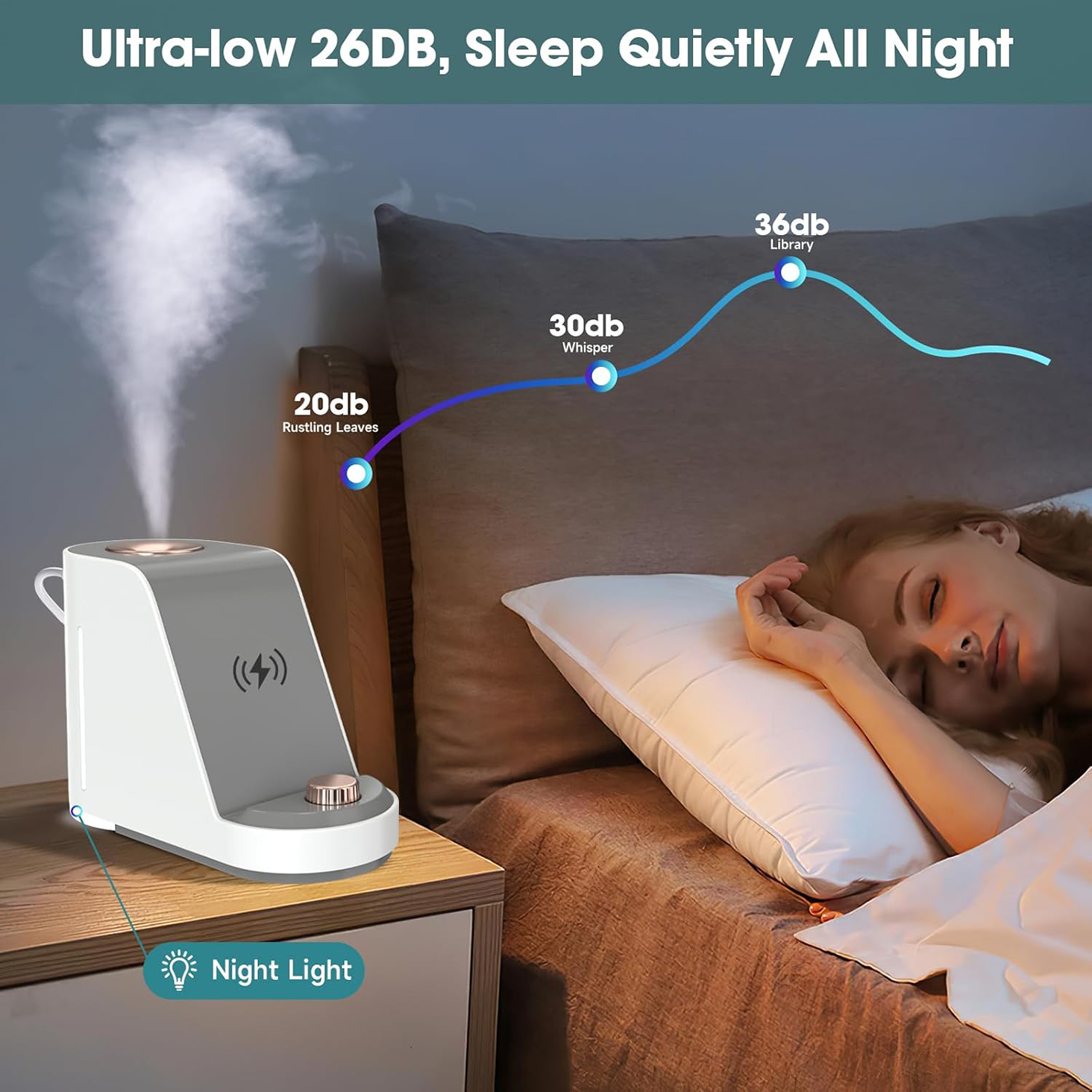 - Operating at just 26 dB, it delivers soothing moisture to support restful sleep and ease discomfort.