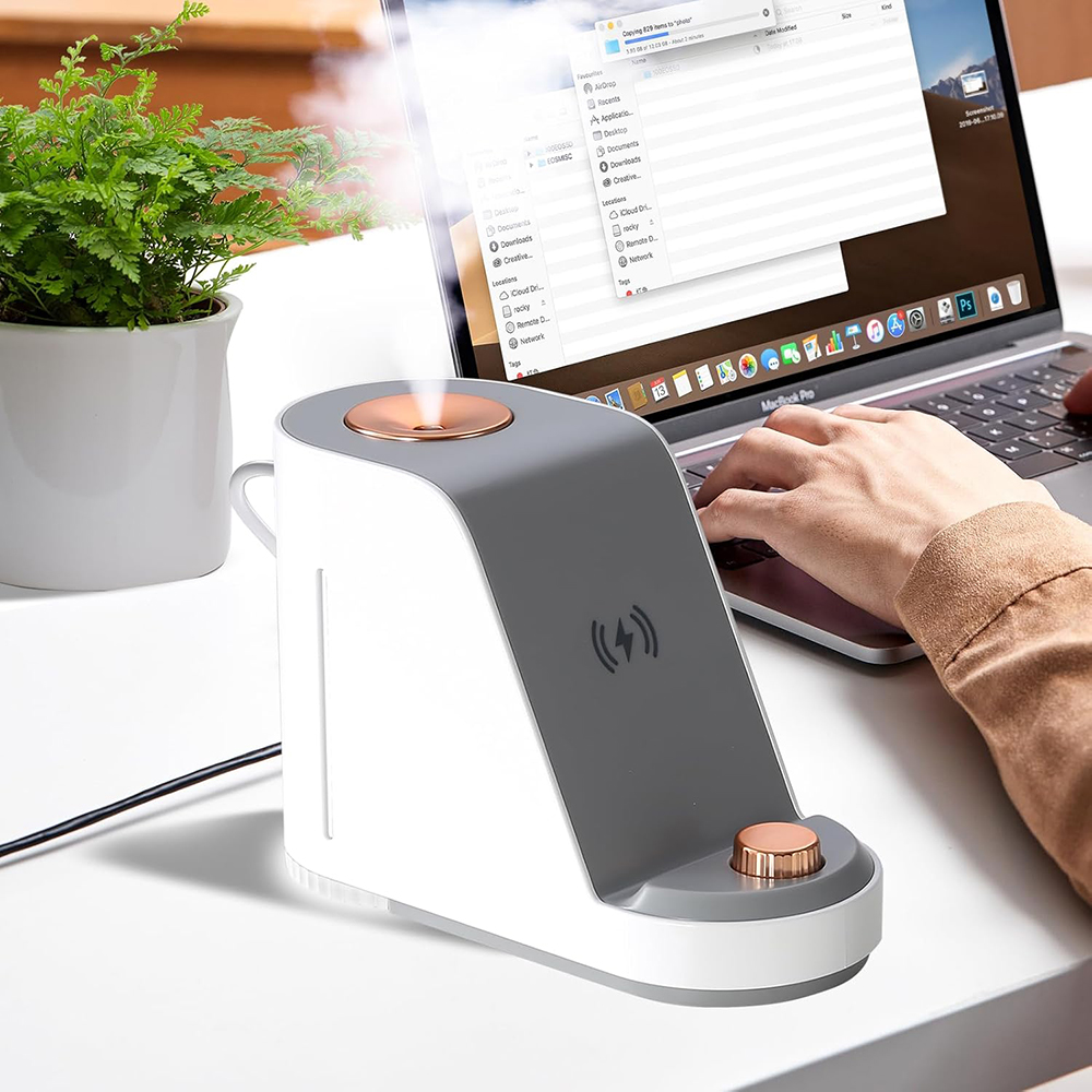 - Experience the ultimate convenience with ultrasonic humidification, wireless charging, a night light, and a phone holder.