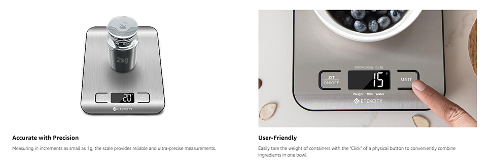 This food scale has been a game-changer for me when counting my macros. It’s super accurate, easy to use, and has a sleek, compact design that fits right on my counter without taking up much space. I love that it can switch between units, making it perfect for weighing everything